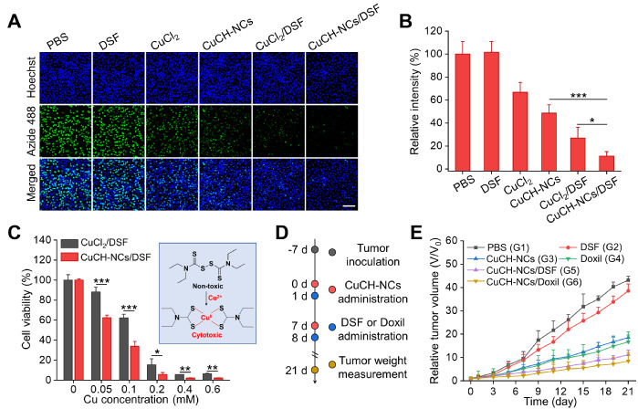 CuCH-NCs响应释放的Cu2+还可激活无细胞毒性的双硫仑(DSF)产生高细胞毒性的复合物,进一步阻断细胞增殖和增强细胞凋亡(图3A-C)。CuCH-NCs/DSF组合的体内抑瘤实验结果表明,化学动力学治疗与DSF-Cu2+复合物介导的化疗能产生更为显著的抑瘤效果(图3D-E)。