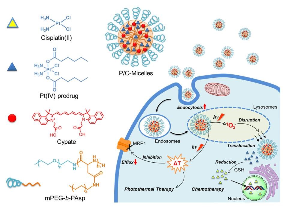 Abstract: Chemotherapeutic drugs frequently encounter multiple drug resistance in the field of cancer therapy. The strategy has been explored with limited success for the ablation of drug-resistant tumor via intravenous administration. In this work, the rationally designed light-triggered nanoparticles with multi-pronged physicochemical and biological features are developed to overcome cisplatin resistance via the assembly of Pt(IV) prodrug and cyanine dye (Cypate) within the copolymer for efficient ablation of cisplatin-resistant tumor. The micelles exhibit good photostability, sustained release, preferable tumor accumulation, and enhanced cellular uptake with reduced efflux on both A549 cells and resistant A549R cells. Moreover, near-infrared light not only triggers the photothermal effect of the micelles for remarkable photothermal cytotoxicity, but also leads to the intracellular translocation of the micelles and reduction-activable Pt(IV) prodrug into cytoplasm through the lysosomal disruption, as well as the remarkable inhibition on the expression of a drug-efflux transporter, multidrug resistance-associated protein 1 (MRP1) for further reversal of drug resistance of A549R cells. Consequently, the multi-pronged effects of light-triggered micelles cause synergistic cyototxicity against both A549 cells and A549R cells, and thus efficient ablation of cisplatin-resistant tumor without re-growth. The multi-pronged features of light-triggered micelles represent a versatile synergistic approach for the ablation of resistant tumor in the field of cancer therapy.